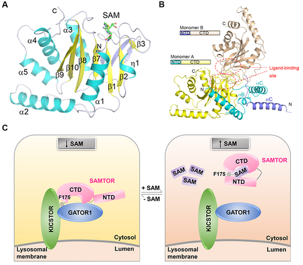 SAMTOR感知SAM以调控mTORC1活性的分子机制。(A)SAMTOR的MTase结构域结合SAM的整体结构;(B)Apo形式的全长dSAMTOR V66W/E67P突变体同源二聚体的整体结构;(C)SAMTOR感知并结合SAM,通过构象变化发挥分子开关功能、调控其与GATOR1-KICSTOR相互作用的分子机制。