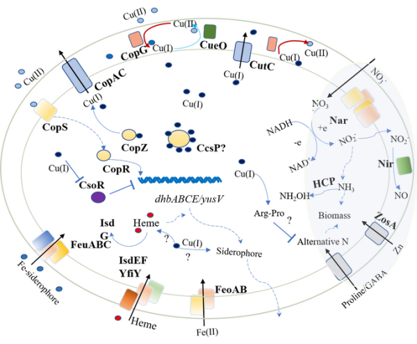 重金属不能被生物降解,具有生物累计和放大等特点,是环境污染研究的焦点。由于在养殖业、农业中的广泛应用和冶炼厂的排放,铜(Cu)成为近年来备受关注的主要重金属之一。与传统的物理化学修复技术不同,微生物修复具有低成本、高效、无二次污染等优点,在重金属污染修复方面展现出应用潜力。本研究从Cu污染土壤中分离了一株Cu抗性菌,该菌株为杆状、兼性厌氧的革兰氏阳性菌。基于测序和性状结果,科研人员将该菌株命名为Bacillus cereus strain T6。该菌株对Cu有很强的抗性,最小抑制浓度为4.0 mM Cu,明显强于其他菌株对Cu的抗性。该菌株对Cu的去除率高,表面吸附和胞内累积在高浓度胁迫时同时发挥功能。转录组学和代谢组学分别检测到362个差异表达基因和60个显著改变的代谢物。多组学(基因组学、代谢组学、转录组学)分析结果表明,Cu暴露诱导了Cu转运和铁稳态相关基因的生成,同时抑制了反硝化途径,导致与金属转运载体、细胞膜重组和抗氧化活性相关代谢产物的积累。