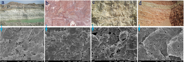 图1.江苏凹凸棒石黏土矿(a)和甘肃砖红色(b)、土黄色(c)和杂色(d)混维凹凸棒石黏土矿数码照片及其相应SEM照片