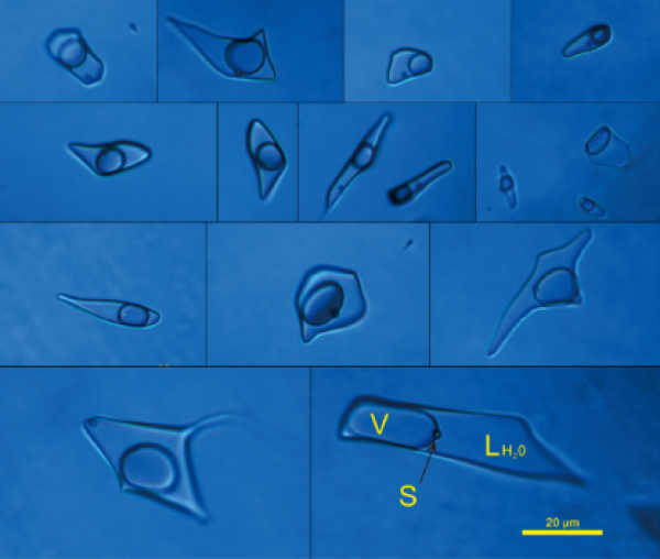 图1.人工合成H2S-H2O±NaCl流体包裹体,V:气态(H2S为主)、S:含H2S及H2Sn的小颗粒、LH2O:含H2S的水溶液。