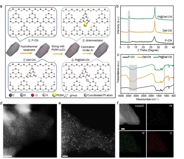 中国科学院地球环境研究所研究员黄宇团队联合大气物理研究所研究员曹军骥、中国科学技术大学教授熊宇杰团队,在原子尺度合成铂单原子负载缺陷聚合碳化氮催化剂(图1),实现高选择性、高活性的光催化CO2甲烷化。该催化剂在模拟太阳光照下,CO2的甲烷化速率达6.3 μmol g-1 h-1,产物对甲烷的碳选择性高达99%(图2)。原位表征和理论模拟结果显示,由于铂单原子和缺陷载体材料的相互作用,使光生电子在催化剂表面富集(图3)和中间产物定向吸附转化(图4),从而实现了CO2的高效活化和产物的高甲烷选择性。该研究为开发高效CO2甲烷化光催化剂提供了新思路。
