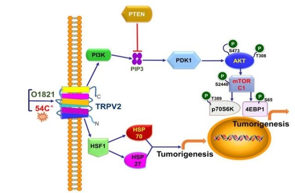 在机制上,TRPV2在ESCC细胞经热应激激活后可上调细胞的热休克因子1(HSF1)并促进热休克蛋白70和27(HSP70/27)的转录表达,从而促进ESCC的成瘤性;同时PI3K在此过程中显著激活,进而激活其下游信号蛋白PDK1,随后PDK1上调靶蛋白AKT1和mTORC1的功能,反之,PI3K的负调控蛋白PTEN受到下调抑制,说明PI3K信号被PTEN放大,从而显著促进ESCC的成瘤性和侵袭力。激活的TRPV2还上调Akt蛋白的S473和T308位点的磷酸化水平,而p-mTOR(S2448)和效应蛋白磷酸化水平p-p70S6K(T389)和p-4EBP1(S65)均相应提升,而Tranilast的应用或TRPV2基因敲除则抑制上述作用。