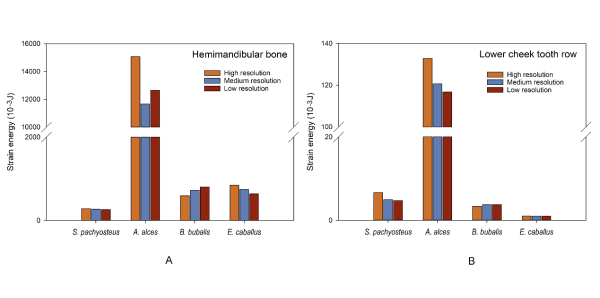 图2.各物种下颌骨(A)和下颊齿列(B)应变能