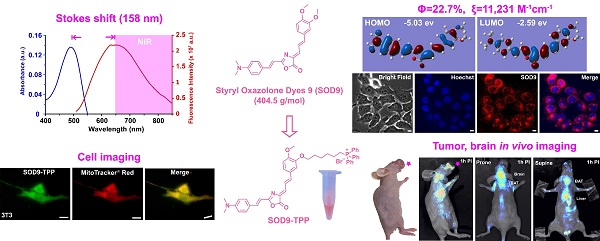 苯乙烯噁唑酮类小分子荧光探针的开发,扩充了常见小分子荧光染料结构集中在氧杂蒽类、二吡咯亚甲基硼类(BODIPY)、花菁类(Cy)和香豆素类的范畴,为小动物活体肿瘤及脑部荧光成像等生物医学应用提供了新选择。