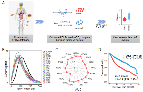 A、基于TCGA数据库中18种癌症鉴定癌症相关的剪接事件流程,B、所有人类外显子和每种癌症类型中异常剪接外显子的长度分布图,C、利用剪接建立随机森林模型在每种癌症类型中的AUC值,D、基于CASE评估的风险因子进行分组的癌症患者的Kaplan-Meier曲线。