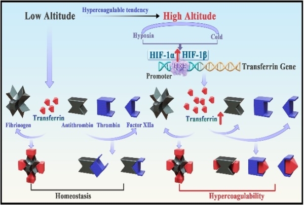 中国科学院昆明动物研究所研究员赖仞团队在血液生理、血栓疾病发病机理和低出血风险抗血栓新药研发方面取得了系列研究成果。近日,该团队与多伦多大学研究团队合作,发现在高海拔地区长期居住的人群和高海拔短期旅行的实验小鼠血浆中关键凝血调控因子转铁蛋白的浓度以及凝血酶和凝血因子XIIa的活性显著升高。进一步动物和细胞实验证实,低氧和低温这两个关键的高原有害因素增强了低氧诱导因子HIF-1α的表达,进而促进转铁蛋白的表达,进一步增强凝血酶和凝血因子XIIa活性,从而诱导血浆高凝倾向。研究表明,高海拔转铁蛋白上调可增加铁离子转运并促进骨髓红细胞的成熟从而增加供氧;转铁蛋白的上调诱导高凝倾向、减缓血液循环从而减少热量损失和氧气消耗,这可能是生物应对低氧和低温这两个极端环境的重要生理补偿策略。重要的是,转铁蛋白干预,包括转铁蛋白抗体治疗、转铁蛋白敲降和设计抑制转铁蛋白凝血因子相互作用的多肽能有效抑制高海拔小鼠模型血栓事件的发生并提高小鼠的生存率。该研究为抗高原血栓新药研发提供了干预策略和全新思路。