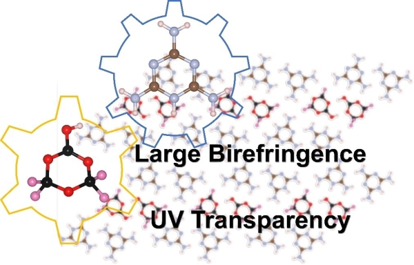 中国科学院新疆理化技术研究所晶体材料研究中心潘世烈研究团队基于混合双折射率活性基元诱导强光学各向异性策略,将有机[C3N6H7]阳离子和无机[B3O3F4(OH)]阴离子结合到一起,设计合成一例新的有机-无机杂化羟基氟化硼酸盐[C3N6H7]2[B3O3F4(OH)]。该化合物的结构以由孤立的有机[C3N6H7]基元和无机[B3O3F4(OH)]基元构成的二维层状结构为特征,其中,由π共轭的有机[C3N6H7]阳离子和[B3O3F4(OH)]基元接近平面排列。混合功能基元的协同作用使该化合物均具有的大双折射率(0.440@546 nm)。基于实空间原子切割和响应电子分布各向异性方法的理论计算表明,π共轭有机阳离子和[B3O3F4(OH)]阴离子均具有双折射率活性。该成果为探索有机-无机杂化体系中的紫外双折射晶体提供了新途径,即选择混合的双折射率活性功能基元来组装化合物可使化合物拥有大双折射率。