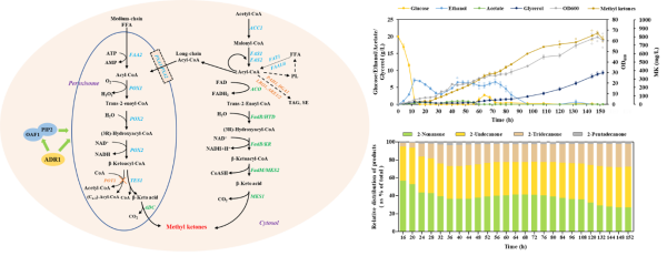 中国科学院天津工业生物技术研究所研究员王钦宏和戴宗杰带领的进化与代谢工程研究团队,通过代谢工程改造,开发了生产甲基酮的酿酒酵母细胞工厂。本研究通过增强酿酒酵母固有的过氧化物酶体脂肪酸β-氧化循环、创建全新异源胞质脂肪酸β-氧化途径,实现了中链甲基酮(2-壬酮、2-十一烷酮、2-十三烷酮和2-十五烷酮)的生物合成。研究运用强化胞内酰基辅酶A生物合成途径,减少用于脂质储存的酰基辅酶A的消耗,以及增强游离脂肪酸转化为酰基辅酶A等手段,增加了合成甲基酮的碳通量,使甲基酮产量提高了7倍,超过140mg/L。研究对菌株进行转录因子工程改造,通过表达ADR1S230A模拟油酸激活过程,促进过氧化物酶体生物发生和增殖,使甲基酮产量进一步提高28%。在分批补料发酵过程中,以葡萄糖为碳源,甲基酮的最高产量超过840mg/L,为真核生物中报道的最高产量。该工作为酿酒酵母作为细胞工厂合成甲基酮奠定了基础。
