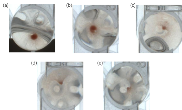 图1.不完全抗体样本检测反应结果:(a)-级、(b)+级、(c)++级、(d)+++级、(e)++++级。