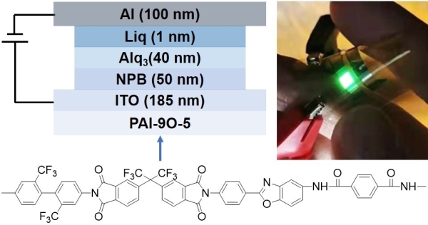 左图:基于理化所无色聚酰亚胺(PAI-9O-5)材料的OLED器件结构示意图;右图:理化所OLED@PAI-9O-5器件在弯曲状态下发光的照片