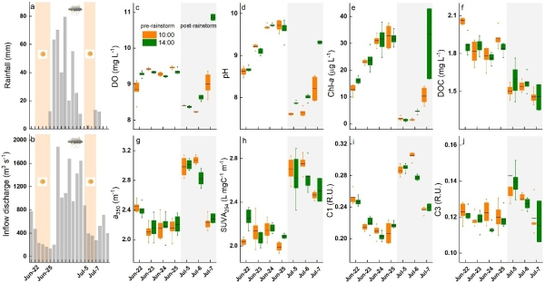 水库作为重要的水生态系统,其碳源汇动态对全球碳循环与碳收支具有重要影响。暴雨过程中微生物高代谢率以及来自上游有机物的持续输入和降解或是水库碳排放的重要来源之一。暴雨导致水温、溶解氧和水化学特征,尤其是溶解性有机物(DOM)来源组成发生变化。这些参数通常在几个小时到几天内迅速波动,并显著影响二氧化碳和甲烷的产生和排放。然而,对水库水体理化参数和DOM来源组成的分析依赖逐周、逐月乃至逐季度的野外观测。