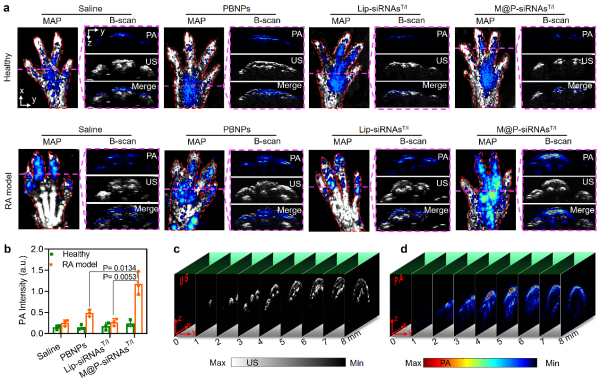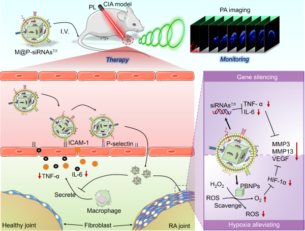 本研究在类风湿关节炎治疗策略方面,突破了传统思路,针对复杂多样的炎症微环境,创新性抑制多个促炎因子相关基因的表达,同时调控RA炎症微环境,清除ROS、缓解乏氧等,起到“双管齐下”的治疗效果;在RA微环境靶向识别方面,利用内源性仿生递送体系天然的炎症趋向特性,解决了基于传统供受体特异识别策略存在的易脱靶的困境;在成像引导和治疗评估方便,采用光声成像技术,解决了荧光成像在关节成像时穿透浅、无深度信息的难题,可获取关节病灶三维实时分子信息,为RA的在体精准治疗提供图像信息,并可对治疗时的血氧等功能信息变化进行监测,为RA的预后评估提供有效的影像学手段。