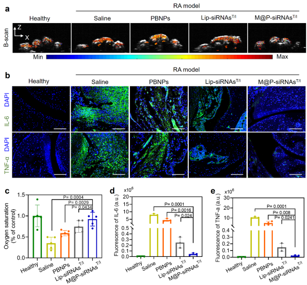 类风湿关节炎体内治疗和疗效评估研究。该研究通过传统的micro-CT、病理染色、临床评分等方法检测治疗后的关节病灶中骨及软骨破坏、免疫和炎症细胞浸润、炎症因子表达水平,发现M@P-siRNAsT/I具有较好的在体治疗效果。同时,研究运用无标记多光谱光声成像方法对关节病灶的血氧饱和度进行连续监测,发现治疗后的关节病灶乏氧状态得到有效缓解,这得到乏氧相关蛋白HIF-1α的组织免疫荧光染色的进一步证实(图5)。