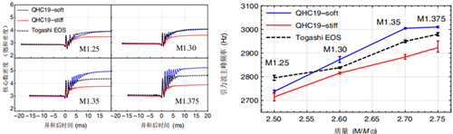 图2 (左图)双中子星并合后的核心密度演化;(右图)不同总质量系统中,双中子星并合过程的引力波主峰频率。黑色虚线表示纯强子状态方程,红、蓝线表示同一强子部分的两种夸克-强子渡越状态方程。