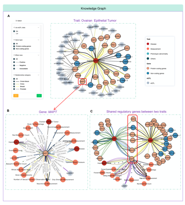 TWAS Atlas关联知识图谱分析示例,分别以上皮性卵巢癌(A)、上皮癌卵巢癌相关基因MAPT(B)以及上皮性卵巢癌与帕金森病共享基因(C)为中心。