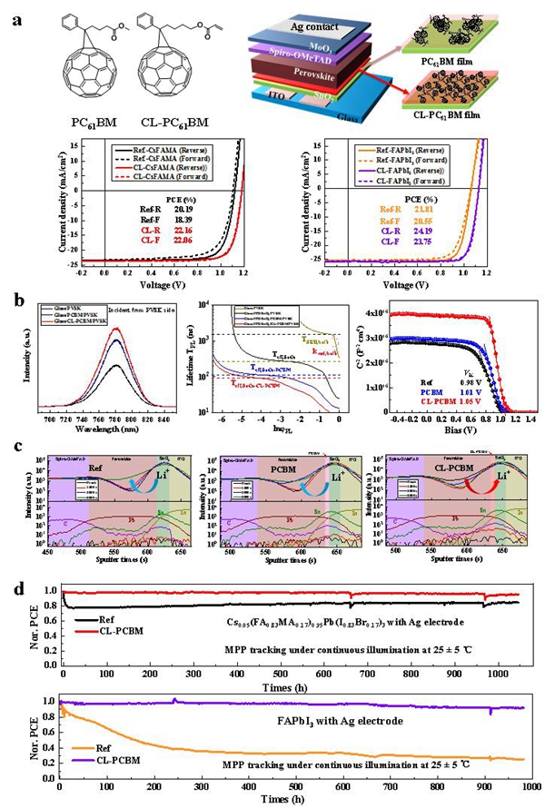虽然该结构电池的运行稳定性得到提升,但是该类光伏电池运行过程中初始几十个小时内往往存在效率的快速衰减过程(burn-in衰减),严重降低了器件的稳定输出效率。针对该问题,研究团队通过器件结构设计及稳定性测试过程中器件内部离子分布、界面复合变化,证实该结构电池中的“burn-in”衰减与SnO2中Li+迁移至钙钛矿/空穴传输层界面有关。通过在SnO2/Perovskite界面引入一个薄层交联PC61BM(CL-PCBM)后可以抑制“burn-in”衰减。TOF-SIMS的结果证明了CL-PBM薄层可以将Li+离子固定在Perovskite/SnO2界面中,而且CL-PCBM的引入可以增加器件的内建电场并提高电子提取效率;最终在Cs0.05(FA0.85MA0.15)0.95Pb(I0.85Br0.15)3体系钙钛矿电池中获得了22.06%的效率,在光照下持续运行1000h后仍保留初始效率的95%,而参比电池仅保留75%;在FAPbI3体系钙钛矿电池中时,获得了24.14%的光电转换效率,同时也消除了“burn-in”衰减过程。这表明利用CL-PCBM界面修饰来消除“burn-in”衰减具有普适性。综上,通过降低器件工作过程中的Li+迁移可以大幅降低钙钛矿太阳能电池稳定性测试初期存在的“burn-in”衰减,提高器件的稳定输出功率(图3)。相关成果以Boosting Perovskite Solar Cells Efficiency and Stability: Interfacial Passivation of Crosslinked Fullerene Eliminates the "burn-in" Decay为题发表于Advanced Materials。