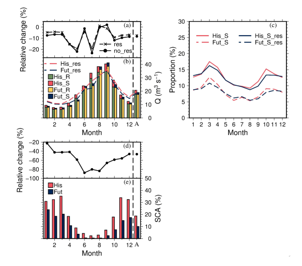 图2.历史和未来条件下流域出口处径流对比(a、b)、有无水库调节下径流融雪贡献率对比(c)和流域积雪覆盖率对比(d、e)。