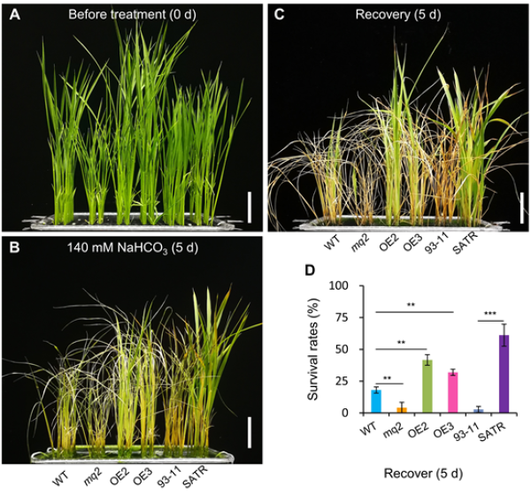 盐碱胁迫影响水稻的生长发育、存活率与最终产量。然而,关于水稻盐碱耐受性的分子调控机制知之甚少。中国科学院成都生物研究所构建了水稻苗期盐碱耐受性温室大规模高通量鉴定体系。科研人员利用该鉴定体系在700余份国内外水稻种质资源中筛选得到一份强耐盐碱的水稻种质资源,并命名为SATR (Salt-Alkali Tolerant Rice)。研究进一步以敏感型栽培稻品种93-11为对照,对SATR进行耐盐碱性表型与生理生化指标系统分析。研究发现,在盐碱胁迫条件下,SATR存活率明显高于93-11,且体内POD活性、可溶性总糖含量显著高于93-11,但丙二醛积累量却显著降低。这说明在盐碱胁迫下SATR通过降低氧化胁迫和调节渗透压来增强对盐碱的耐受性。