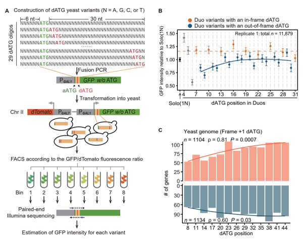 (A)高通量构建双起始密码子突变体文库;(B)突变体文库分析揭示不对框的下游ATG(dATG)对翻译的抑制;(C)酵母基因组中不对框dATG数量随与aATG距离接近而减少(上图展示“强”翻译起始序列的dATG,下图展示“弱”翻译起始序列的dATG)。