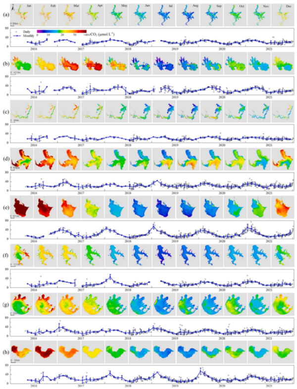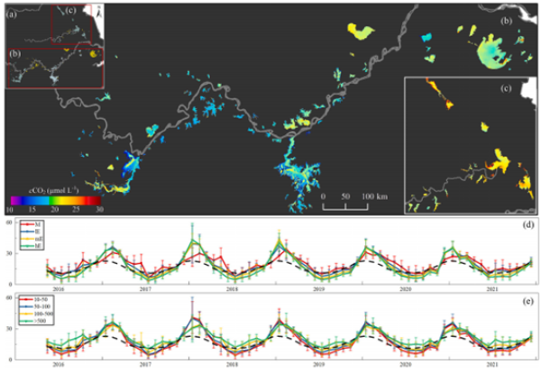 针对如何利用遥感手段估算区域湖泊群CO2问题,中国科学院南京地理与湖泊研究所研究员段洪涛课题组博士生齐天赐以江淮中下游湖泊群为研究对象,结合野外实测表层水体CO2浓度数据与基于Sentinel-3卫星数据获取的湖泊水环境因子等产品,在太湖藻型湖区CO2浓度遥感估算模型的基础上(Qi et al.,ES&T,2020),改进开发了适用于中营养-富营养状态湖泊的CO2浓度经验估算模型,并重构江淮中下游湖泊群2016-2021年的CO2浓度时空动态。相关研究成果发表在Remote Sensing of Environment上。