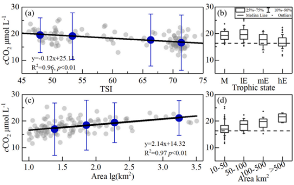 图4.卫星估算年平均CO2浓度与湖泊营养状态指数(a, b),以及与湖泊面积(c, d)的关系