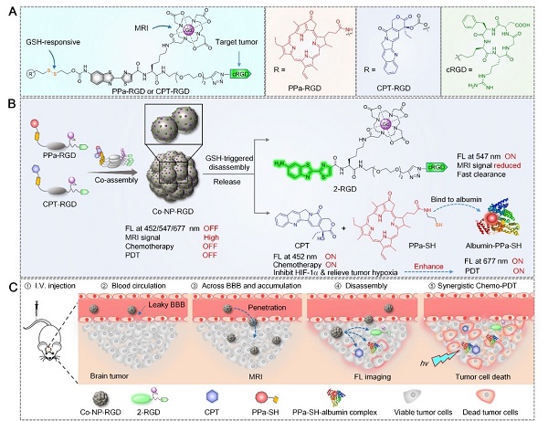 研究团队基于分子共组装和可控解组装策略,分别合成了αvβ3整合素靶向、谷胱甘肽响应的顺磁性近红外光敏探针(PPa-RGD)和喜树碱前药(CPT-RGD);通过优化这两个分子的共组装比例,制备了兼具生理稳定性和协同治疗的共组装纳米诊疗探针(Co-NP-RGD)(图1)。通过静脉给药后,Co-NP-RGD相比小分子药物能有效延长血液循环时间,并借助表面存在的大量cRGD靶向基团,穿越BBB,靶向递送到原位脑胶质瘤细胞(U87MG和U251)中,一方面产生增强的核磁共振成像造影信号用于定位处于脑部的原位脑胶质瘤;另一方面,在脑胶质瘤细胞内高浓度谷胱甘肽作用下,发生快速解组装,同时释放出喜树碱原药(CPT)和近红外光敏剂(PPa),从而恢复光动力治疗功能,产生增强的近红外荧光信号用于监测药物的释放和蓄积。此外,释放的小分子卟啉光敏剂进一步与肿瘤细胞内的白蛋白结合,能延长光敏剂分子在肿瘤细胞内蓄积,而同时释放的喜树碱可以抑制乏氧诱导因子HIF-1α,进而改善脑胶质瘤组织中的乏氧环境,增强对深层原位脑胶质瘤的光动力治疗疗效。在双模态成像信号的指导下,用低剂量的690 nm激光(0.2 W/cm2)照射小鼠的原位脑胶质瘤,产生化疗-光动力治疗协同治疗,能有效延缓了原位脑胶质瘤的生长,并延长小鼠的生存期,实现对原位脑胶质瘤的高效协同治疗(图2)。该研究设计的分子共组装和可控解组装策略,可以进一步应用于构建其他肿瘤靶向和激活的纳米药物以产生癌症的联合治疗效果,促进癌症的诊疗。