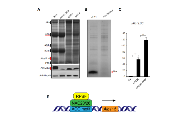 中国科学院植物研究所研究员刘春明团队等发现水稻品种中花11的NAC20/NAC26双敲除突变体nac20/26-3胚乳中醇溶蛋白累积略有减少,而16 kD清蛋白的累积几乎消失。质谱分析结果表明由Alb1、Alb2、Alb3、Alb4编码的四种清蛋白丰度在nac20/26-3突变体中急剧降低。qRT-PCR分析显示,突变体胚乳所有编码清蛋白合成的五个基因Alb1-5的表达均大幅度降低。进一步实验证明NAC20/26转录因子是通过与Alb1-5启动子区域的ACG保守基序结合激活胚乳中清蛋白表达,从而激活水稻胚乳清蛋白累积,其中NAC26的激活作用比NAC20更有效,这一活性差别是因为其中间区段的序列差异导致的。通过酵母双杂交试验,研究人员鉴定到与NAC20/26互作的水稻醇溶蛋白结合因子RPBF,并利用基因编辑技术获得了两个独立的突变体rpbf-1和rpbf-2,这两个突变体籽粒皱缩,胚乳中包括清蛋白在内的多种贮藏蛋白含量均有部分降低,在rpbf突变体胚乳中Alb的表达量显著降低,RPBF不能直接编码结合清蛋白基因的启动子,但是能够与NAC20/26互作增强NAC20/26对16 kD清蛋白基因表达的激活活性,间接控制水稻胚乳中清蛋白的积累。这一研究解析了水稻胚乳中清蛋白累积的分子调控机理,为在育种过程中调控清蛋白含量奠定了基础,也可能为大米消费者应对过敏原问题提供解决方案。
