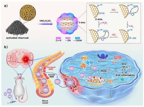 (a)碳点SOD纳米酶的制备、催化机制及(b)其在缺血性中风治疗中的应用
