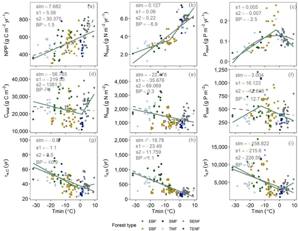 中国科学院华南植物园鼎湖山森林生态系统定位研究站研究人员,基于中国碳专项127个典型森林样地调查数据,结合GOLUM-CNP循环模型,估算了生态系统碳氮磷留存时间,分析了生态系统碳氮磷留存时间与环境因子的关系。研究发现,调控森林生态系统碳氮磷留存时间的外部环境要素主要是气温(图1),总体表现出随最冷月平均最低温(Tmin)升高而留存时间呈现减少的规律。温带森林和亚热带常绿森林碳磷留存时间随Tmin变化的规律不同(图2),这与两个气候带森林生长的季相变化有关。该研究利用创新方法计算了我国典型森林生态系统碳氮磷留存时间,有助于理解森林生态系统碳氮磷周转对环境因子的响应,可为碳氮磷循环模型改进等研究工作提供依据。