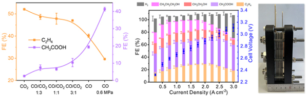 相关研究成果以Coverage-driven selectivity switch from ethylene to acetate in high-rate CO2/CO electrolysis为题,发表在《自然-纳米技术》(Nature Nanotechnology)上。研究工作得到国家重点研发计划、国家自然科学基金、中科院战略性先导科技专项(A类)“变革性洁净能源关键技术与示范”等的支持。