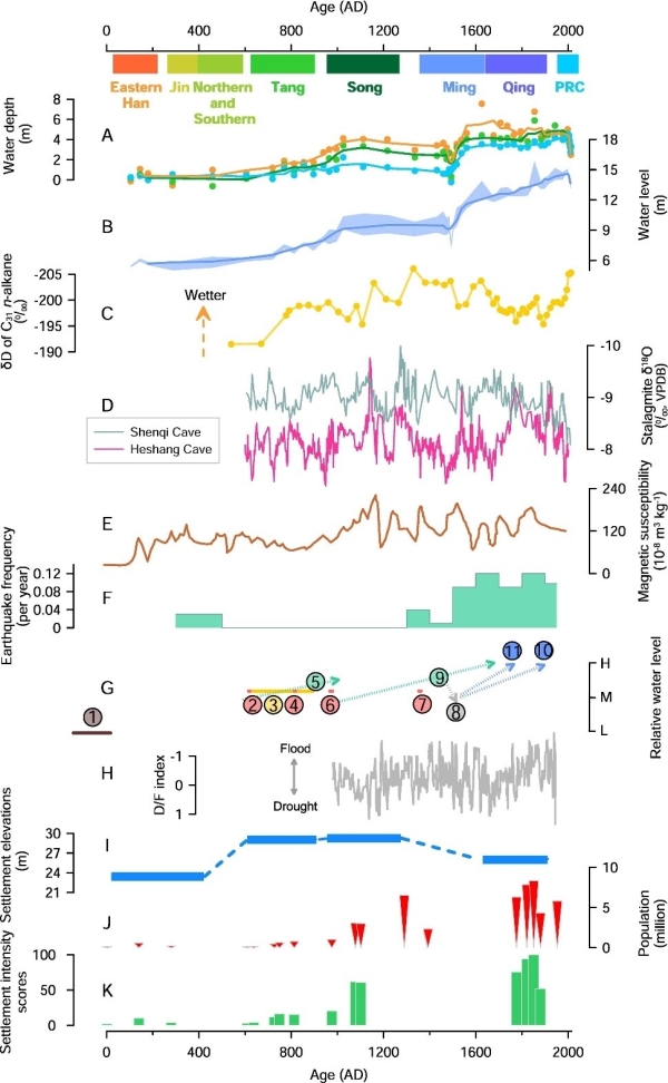 过去两千年鄱阳湖流域环境变化与人类响应:(A)GDGTs指标重建的鄱阳湖水深变化;(B)GDGTs指标重建的鄱阳湖水位变化;(C)叶蜡氢同位素记录(Yao et al., 2015);(D)和尚洞与神奇洞氧石笋同位素记录(Hu et al., 2008; Tan et al., 2018);(E)湖口ZK2钻孔磁化率(Hu, 1999);(F)鄱阳湖地区古地震频率(Earthquake Office of Jiangxi Province, 1982);(G)史料记载的鄱阳湖水位相对变化信息;(H)永修县干旱/洪涝记录(Gu et al., 2022);(I)四个主要时代鄱阳湖城镇平均海拔;(J)鄱阳湖地区人口变化(Ge, 2005);(K)鄱阳湖地区古城镇人口密度。