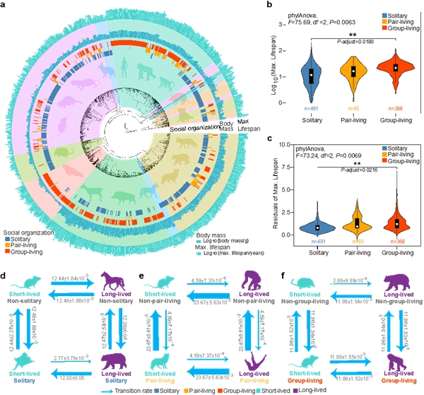 2月1日,中国科学院动物研究所研究员周旭明团队整合系统发育比较方法和组学方法,开展了社会性组织和寿命的跨物种比较研究。该研究利用系统发育比较分析方法对约1000种哺乳动物进行分析,发现群居物种比独居物种更长寿。研究通过对社会组织与寿命的独立模型和关联模型的比较分析,发现在群居物种中短寿向长寿的转化率更高(图1)。上述研究表明寿命的演化依赖于社会组织的演化,即在哺乳动物中,社会组织与寿命之间存在关联演化。