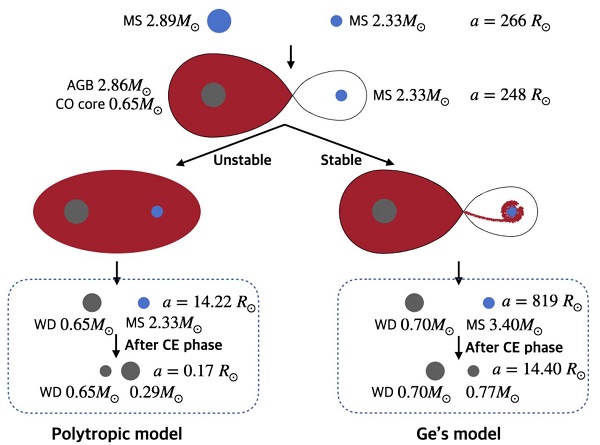 双白矮星在形成过程中,至少要经历一次双星物质交流,而物质转移的稳定性直接决定了双星的最终演化产物。早期研究中,人们多采用多方模型给出的双星物质转移稳定性判据。近年来,有研究通过建立绝热物质损失模型(Ge模型),给出了恒星在不同演化状态下物质转移稳定性判据。相比于多方模型给出的结果,新的判据认为恒星在巨星支发生物质转移更趋向于动力学稳定。因此,当采纳新的物质转移稳定性判据后,双白矮星的性质将发生根本性改变(图1)。