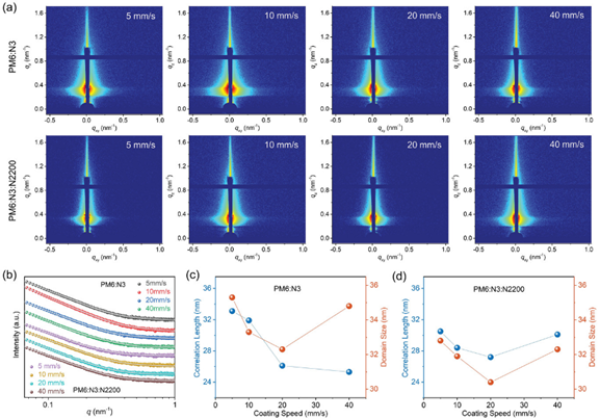 中国科学院上海高等研究院上海光源研究团队经过近年来系统的In-house研究,基于小角散射线站(BL16B1)建立了有机太阳能电池液相成膜原位掠入射小角X射线散射(GISAXS)、原位掠入射广角X射线散射GIWAXS以及和原位紫外可见光光谱(UV-vis)相结合的实时测量技术,发展了用于原位实时测量批量数据处理所需的软件SGTools(J. Appl. Crystallogr. 2022, 55, 195.)。近日,上海高研院副研究员杨春明联合天津大学教授叶龙等,应用上述同步辐射原位掠入射X射线散射多方法结合技术,首次揭示了刮涂三元OSC的溶液剪切成膜机制及其构效关系。相关研究成果以Real-Time Probing and Unraveling the Morphology Formation of Blade-Coated Ternary Nonfullerene Organic Photovoltaics with In Situ X-Ray Scattering为题,发表在Advanced Functional Materials上。