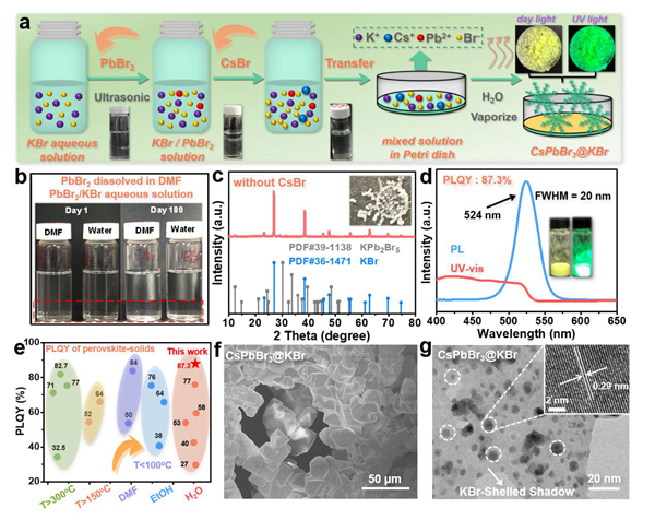 研究显示,运用简单的水蒸发结晶策略即可制备高发射窄半高峰宽的金属卤化物固体,巧妙地引入溴化钾盐使得难溶于水的溴化铅完全溶解在水中,不仅赋予了材料高量子产率,而且提升了产物光和热稳定性。得益于水蒸发结晶策略,前驱体水溶液可制备成水性墨水,通过与水性聚合物混合可以制备出柔性荧光薄膜,并可以通过喷墨打印技术打印相关图案。