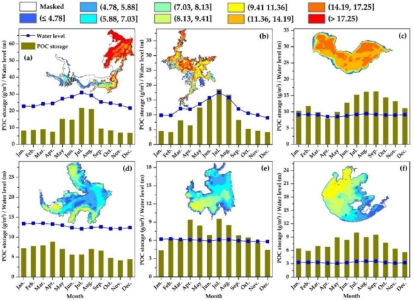 在我国江淮湖泊群,不同湖泊的表层POC浓度空间差异较大;洞庭湖、鄱阳湖、巢湖、洪泽湖和太湖等五大淡水湖的表层POC浓度呈现明显空间异质性,整体表现为湖湾处表层POC浓度高。河流输入会明显湖泊POC分布,在受河流输入影响明显的河口水域会呈高POC含量。不同湖泊表层POC浓度均表现明显的季节变异特征,整体上表现为夏季高、冬季低、春秋季相当。尽管一些湖泊的水位季节变化不明显,但不同湖泊的水柱POC储量均表现出明显的季节变异特征。该研究构建了面向过程的富营养湖泊水柱POC储量遥感流程,并基于OLCI/Sentinel-3遥感反演结果厘清了我国江淮富营养湖泊群POC含量的三维时空变异特征,这对全球湖泊碳循环研究具有重要意义。