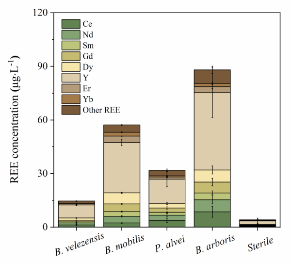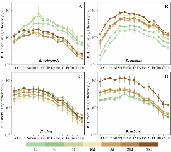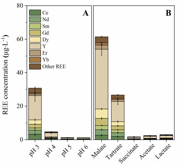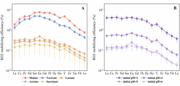 研究发现,在常温常压及寡营养条件下,实验菌株均能显著促进花岗岩中稀土元素的活化。30天反应结束时,微生物将总稀土元素表观溶解量提升约4-21倍(图1)。而在实际反应过程中,部分溶解的稀土元素会被微生物细胞和胞外代谢物再次吸附固定,这使得稀土元素的表观溶出率被降低约25%-82%。微生物生长代谢导致溶液酸化并分泌丰富的小分子有机酸,从而对花岗岩溶解产生积极影响。在实验菌株溶解花岗岩的过程中,溶液pH在弱酸性至近中性范围内。此条件下,有机酸配体的络合作用是微生物促进稀土元素释放的主导机制(图2)。