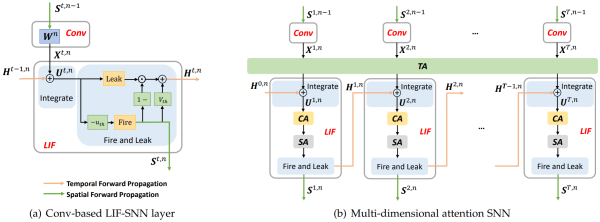 图2.多维度注意力脉冲神经网络,注意力机制被用来调节膜电势分布