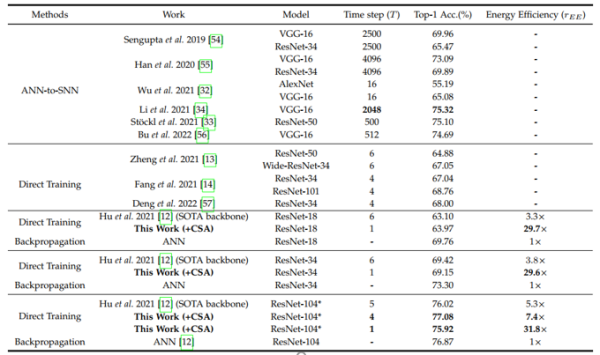 科研团队在基于事件的动作识别数据集以及静态图像分类数据集ImageNet-1K上对提出的多维度注意力脉冲神经网络进行实验。实验表明,注意力模块的加入帮助脉冲神经网络在性能上有显著提升,网络中的脉冲数量也能降低,从而降低模型能耗。在DVS128 Gait数据集上,多维度注意力模块能够使原始脉冲神经网络降低81.6%的脉冲发放,同时带来4.7%的性能提升(表1)。在ImageNet-1K数据集上,注意力脉冲神经网络首次取得了与传统人工神经网络相当的性能,且理论能效为同等结构人工神经网络的31.8倍(表2)。