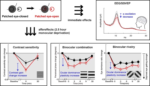 当双眼在黑暗中睁开相对于闭上时,尽管均没有视觉输入,大脑内生的抑制性神经活动会显著减弱,表现为枕叶alpha神经震荡幅度的下降。然而,双眼闭上时无法通过视觉刺激测量视觉功能,因此这种大脑内生神经状态的改变如何调节视觉功能及其可塑性是一个难以回答的问题。该研究发现,单眼遮盖时被遮盖眼的睁开和闭上,亦可造成与双眼睁开闭上类似的大脑内生神经活动的改变,表现为被遮盖眼睁开时alpha振荡幅度显著减弱。抑制性神经活动的下降提升了非遮盖眼的对比敏感度,并且增强了视觉刺激诱发的神经活动。为了进一步探索大脑内生神经活动是否能够调控视觉可塑性,受试者分别进行了被遮盖眼睁开和闭上两种情况下的短时(2.5小时)单眼剥夺。结果表明,短时单眼遮盖诱发的眼优势可塑性受大脑内生神经状态的调节,当被遮盖眼睁开相对于闭上时诱发了更强的可塑性。由于枕叶alpha震荡主要来自抑制性神经元的同步性发放,这些结果提示单眼遮盖治疗中调控GABA神经环路的功能能够促进双眼平衡的恢复。