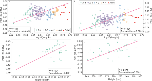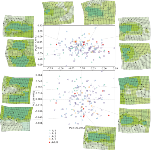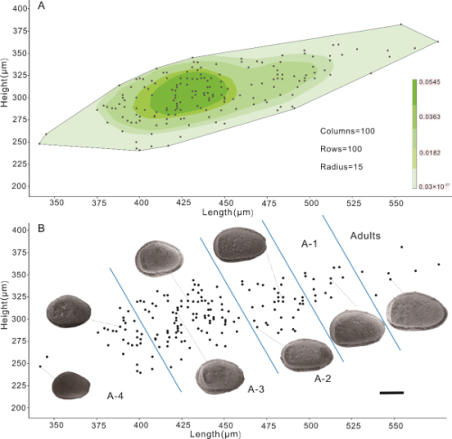 本研究精选178枚产自新疆西准噶尔上泥盆统洪古勒楞组的C. honggulelengensis标本,并运用形态统计学方法获取界点及半界点坐标等基础数据。该工作利用PAST软件中的“高斯核密度分布”将研究类群划分为5个生长阶段(Adult,A-1~A-4),解决了化石介形类龄期划分的难题。研究采用主成分分析、回归分析、薄板样条热力图等定量方法对不同龄期的壳体形态进行分析发现,C. honggulelengensis在生长发育的早中期(即A-4~A-2)壳体形态变化最明显,即在早期壳体整体形态为卵圆形,前端、后端均为圆形,且少量小点孔分布于壳面后部至中部;随着壳体的增长,壳形变得伸长,点孔变大且密布于整个壳面之上。