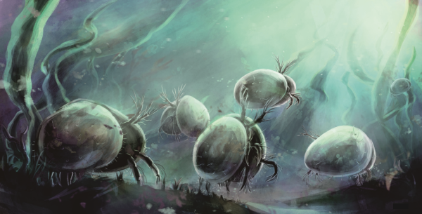图5.新疆西准噶尔地区上泥盆统洪古勒楞组产出的Cribroconcha honggulelengensis Song & Crasquin, 2017的生态复原图