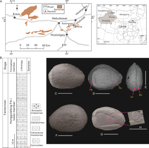 图1.新疆西准噶尔地区的布龙果尔研究剖面和Cribroconcha honggulelengensis Song & Crasquin, 2017