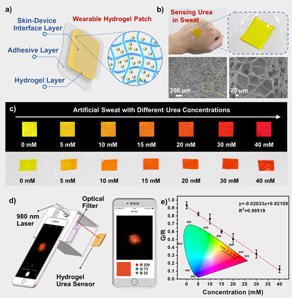 尿素是人体含氮物质最终代谢的主要产物,会通过汗液、尿液、唾液和血液排出,其在临床诊断中被认为是肾功能的重要指标,因此有效检测尿素水平对于疾病的研究和早期诊断至关重要。可穿戴传感器由于可以直接佩戴在人体皮肤上且具有非侵入性的特性受到广泛关注,三维网络状结构的水凝胶具有良好的柔韧性、拉伸性和生物相容性,这些特性使其成为可穿戴传感器的理想材料,然而目前报道的大多数荧光水凝胶都是由短波长激发的,在检测生物样品时容易受到自发荧光和背景荧光的干扰。上转换纳米粒子(UCNPs)与传统的荧光材料相比,能消除生物样品的自荧光和背景干扰,提高检测灵敏度。因此,利用UCNPs设计可穿戴传感器是检测人类生物标志物的有效策略。