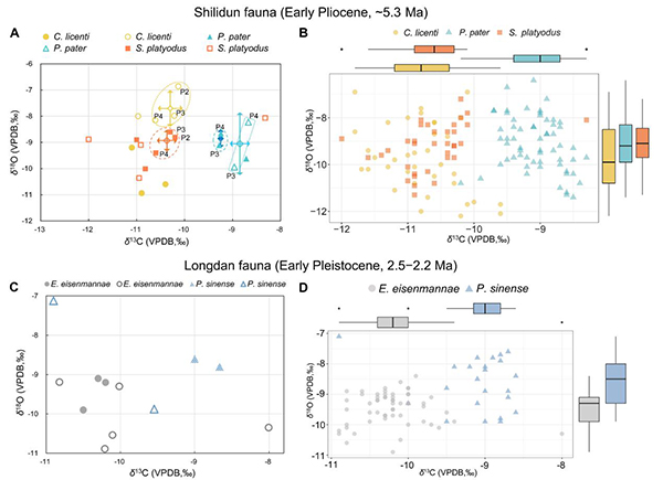 研究发现,在上新世早期的十里墩动物群中,原始长鼻三趾马(Proboscidipparion pater)比共生的桑氏垂鼻三趾马(Cremohipparion licenti)和平齿西瓦三趾马(Sivalhippus platyodus)更能适应干旱开阔的环境,而后两者的生态位基本重叠,比原始长鼻三趾马摄入了更多叶片(图2)。及至更新世,三趾马族在全世界范围内急剧衰落,东亚地区仅剩2种,原始长鼻三趾马的直系后代——中国长鼻三趾马(Proboscidipparion sinense)就是其中之一。而在临夏盆地早更新世的龙担动物群中,中国长鼻三趾马同样占据了最开阔的生态环境,比共生的大型真马埃氏马Equus eisenmannae摄入了更多的粗糙草类资源。