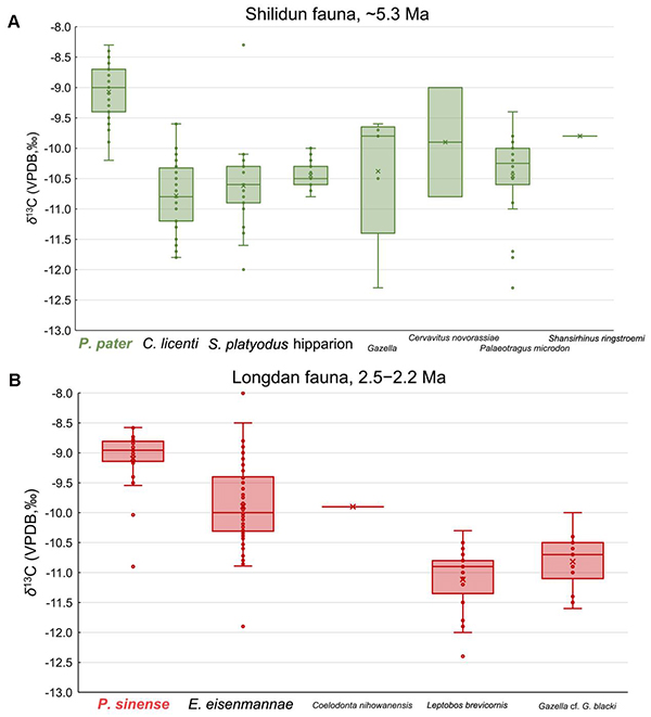 图4.临夏盆地十里墩和龙担动物群的碳同位素汇总数据图,其中原始长鼻三趾马和中国长鼻三趾马在各自所处的两个动物群中拥有最高的碳同位素值