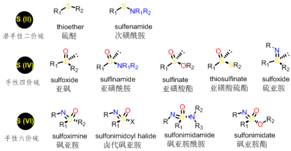 有机硫化合物在有机化学与药物化学中具有重要作用。由于硫原子独特的化学性质,多种价态的含硫化合物存在,广泛应用于有机催化、医药、农药等领域。如图1所示,具有潜手性的二价硫——硫醚、次磺酰胺等;具有手性的四价硫——亚砜、亚磺酰胺、亚磺酸酯、亚磺酸硫酯、硫亚胺等;具有手性的六价硫——砜亚胺、卤代砜亚胺、砜亚胺酰胺、砜亚胺酯等。