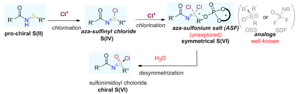 目前,手性六价硫衍生物得制备方法主要包括:以手性亚砜、手性亚磺酰胺,或者手性硫亚胺为底物进行不对称转化;以对称性的砜亚胺为底物,通过催化对映选择性去对称化策略,制备各种类型手性砜亚胺衍生物。这些方法受限于手性底物的制备,或者对称性砜亚胺底物的制备,因此缺少比较通用的制备手性六价硫衍生物(包括砜亚胺、氯代砜亚胺、氟代砜亚胺、砜亚胺酰胺、砜亚胺酯)的方法。研究以潜手性次磺酰胺为底物,通过连续两次氧化氯代生成对称性的二氯代砜亚胺阳离子中间体。该中间体与手性磷酸根形成离子对,通过对映选择性地去对称水解,得到手性氯代砜亚胺(图2)。