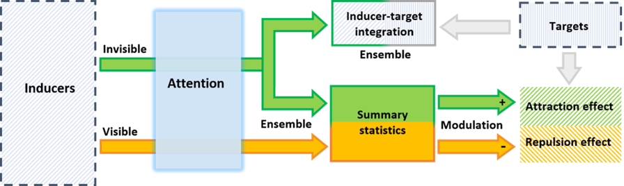 中国科学院心理研究所脑与认知科学国家重点实验室蒋毅团队针对上述问题采用临界闪烁融合范式(CFF)操纵刺激的可见性,用一系列行为实验考察了意识上和意识下的集合表征信息对另一组刺激知觉决策的影响及其认知机制。