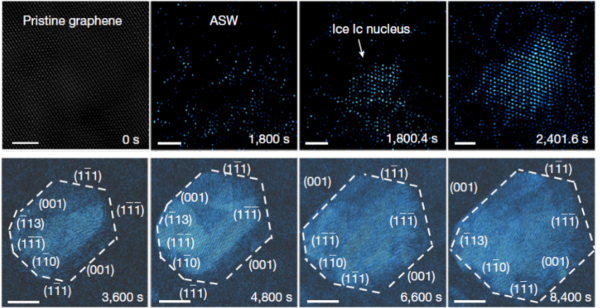 研究展示了-170℃左右的低温衬底上气相水凝结成冰晶的过程,发现了立方冰在这种低温衬底上的优先形核生长。分子级成像证实了水结晶可以形成各种形貌不一的单晶立方冰。而随着时间的增加,冰晶整体中六角冰的占比逐渐增加。研究分析提出,这表明异质界面在立方冰的形成中起着重要作用。而自然界中常见的降雪大多都是水分子在灰尘矿物质等表面的凝聚生长,且这种异质界面无处不在。